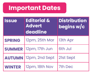 Space for editorial/advertising and distribution deadlines: